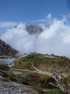 ゴンドラを乗り継ぐこと3回。 ヒーヒーハーハー 喘ぎながら登ること1時間半。 やっと、八方池に着きました。 青空と山と池と紅葉 そして湧き上がる雲 青空と山と池と紅葉 湧き上がる雲 その絶妙なバランスが なんとも言えずきれい。 そんな中 延々と尾根に続く人の列 苦しさに喘ぎながらも 粛々と みんな、高嶺を目指して 登り続けておりました。 高嶺を目指して・・・ その姿に わたしはなぜか 人生を考えてしまったのです。